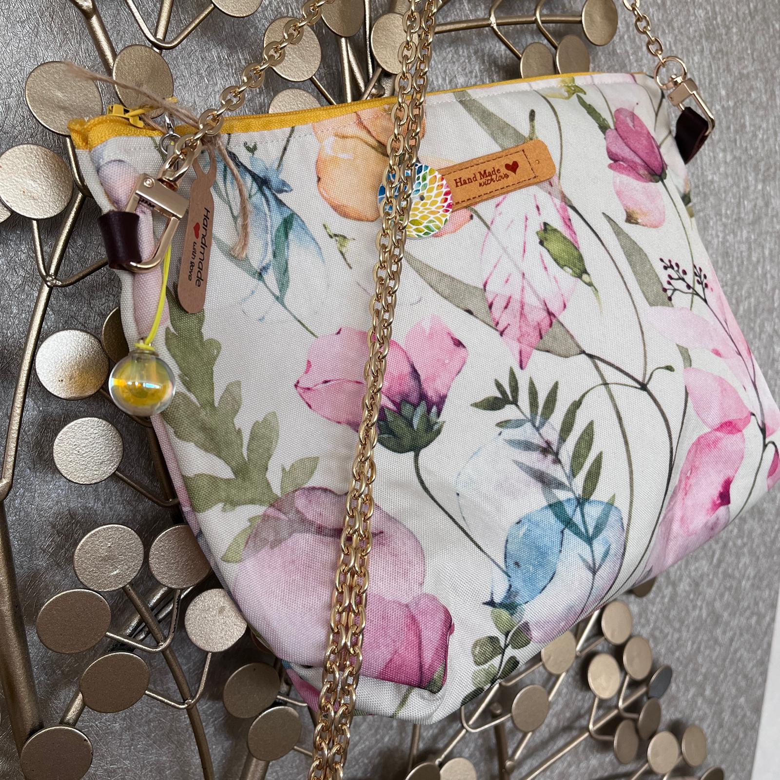 Borsetta con motivo floreale, bottoncino in legno, etichetta in camoscino, pendaglio, tracolla in metallo dorato. Interno in lino e cotone.