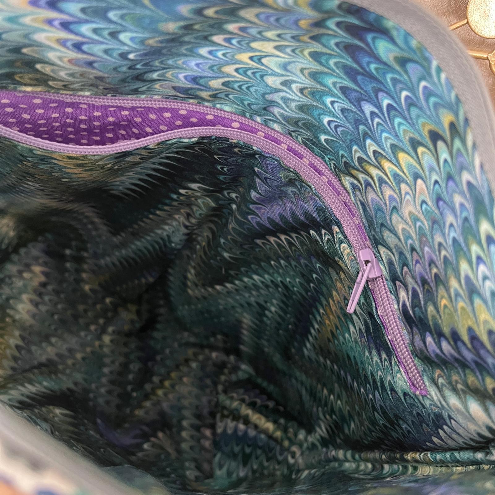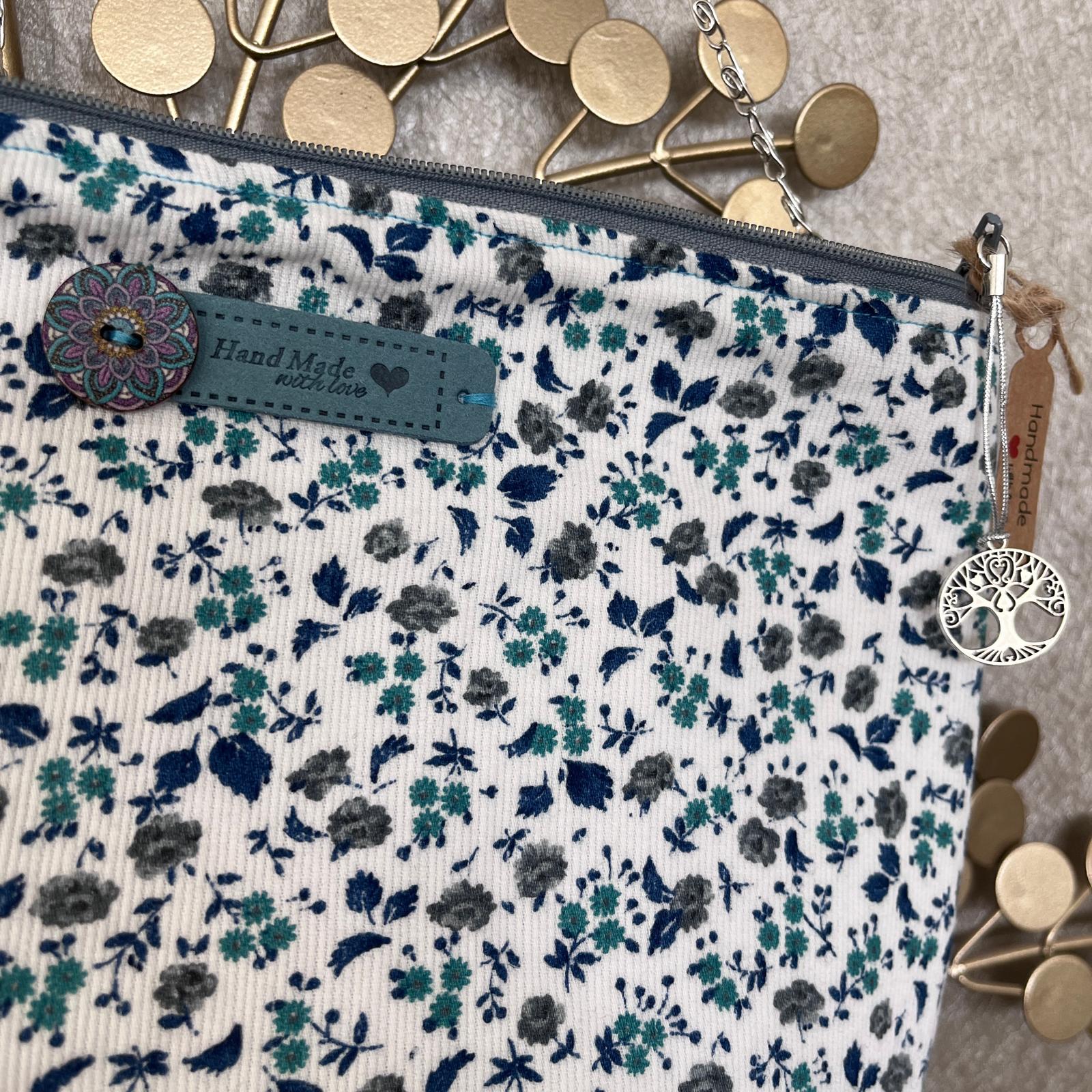 Borsetta in morbido velluto di cotone millerighe con bottoncino in legno, etichetta, pendaglio. Fodera in cotone con tasca interna con cerniera. Tracolla in metallo color argento.
