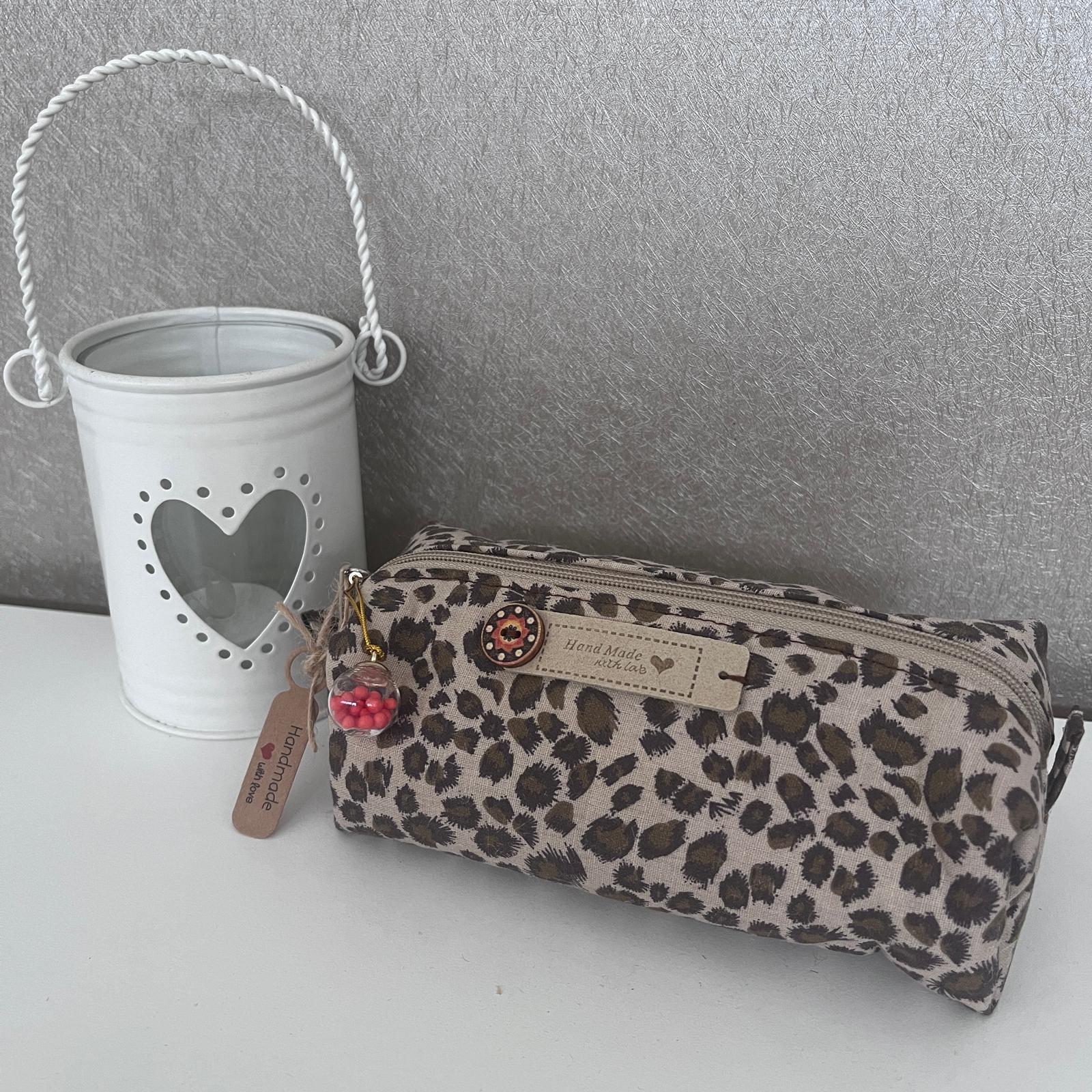 Astuccio in cotone foderato con etichetta, bottoncino in legno e pendaglio.