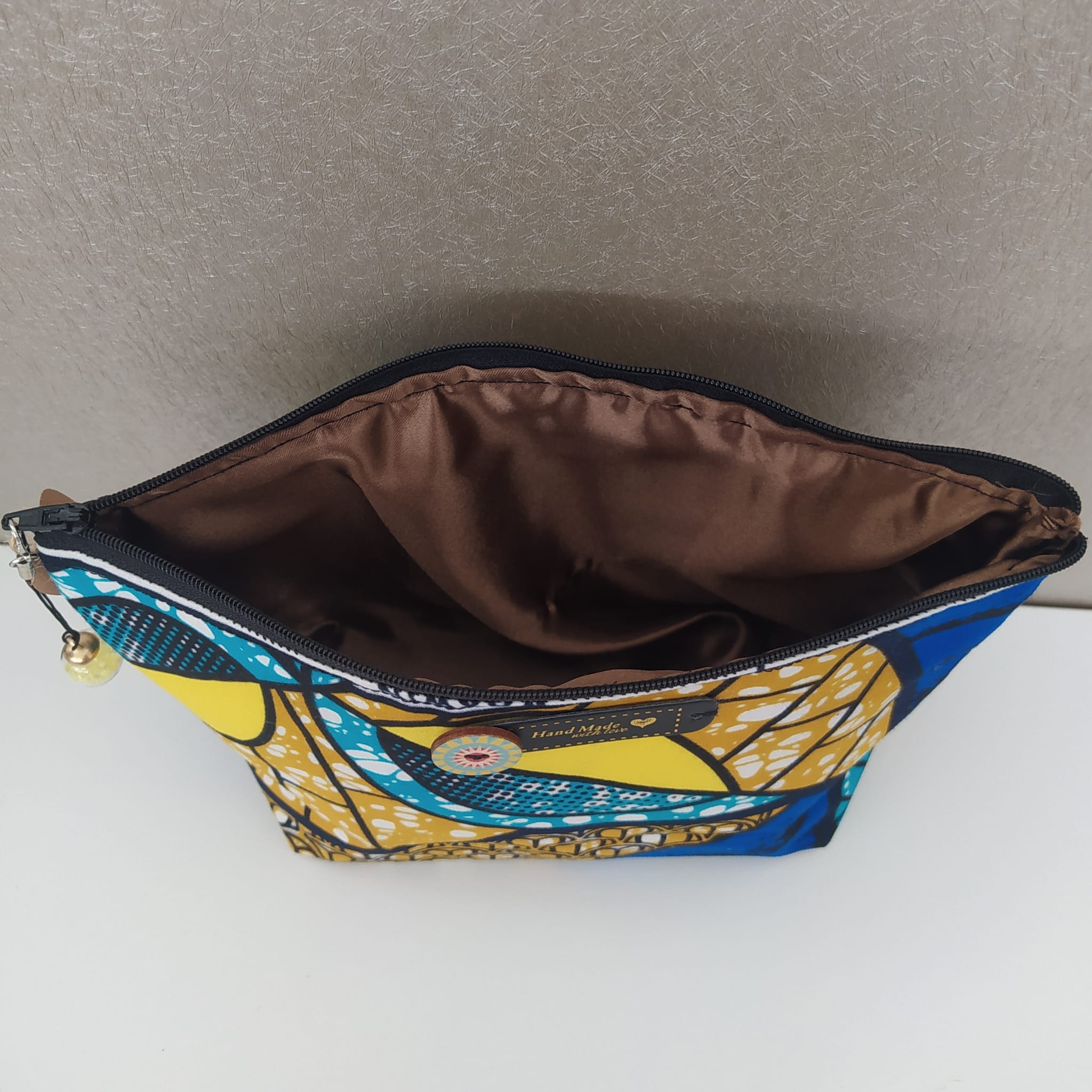 Pochette in resistente cotone con bottoncino in legno, etichetta e pendaglio, foderata in taffetà marrone cangiante.