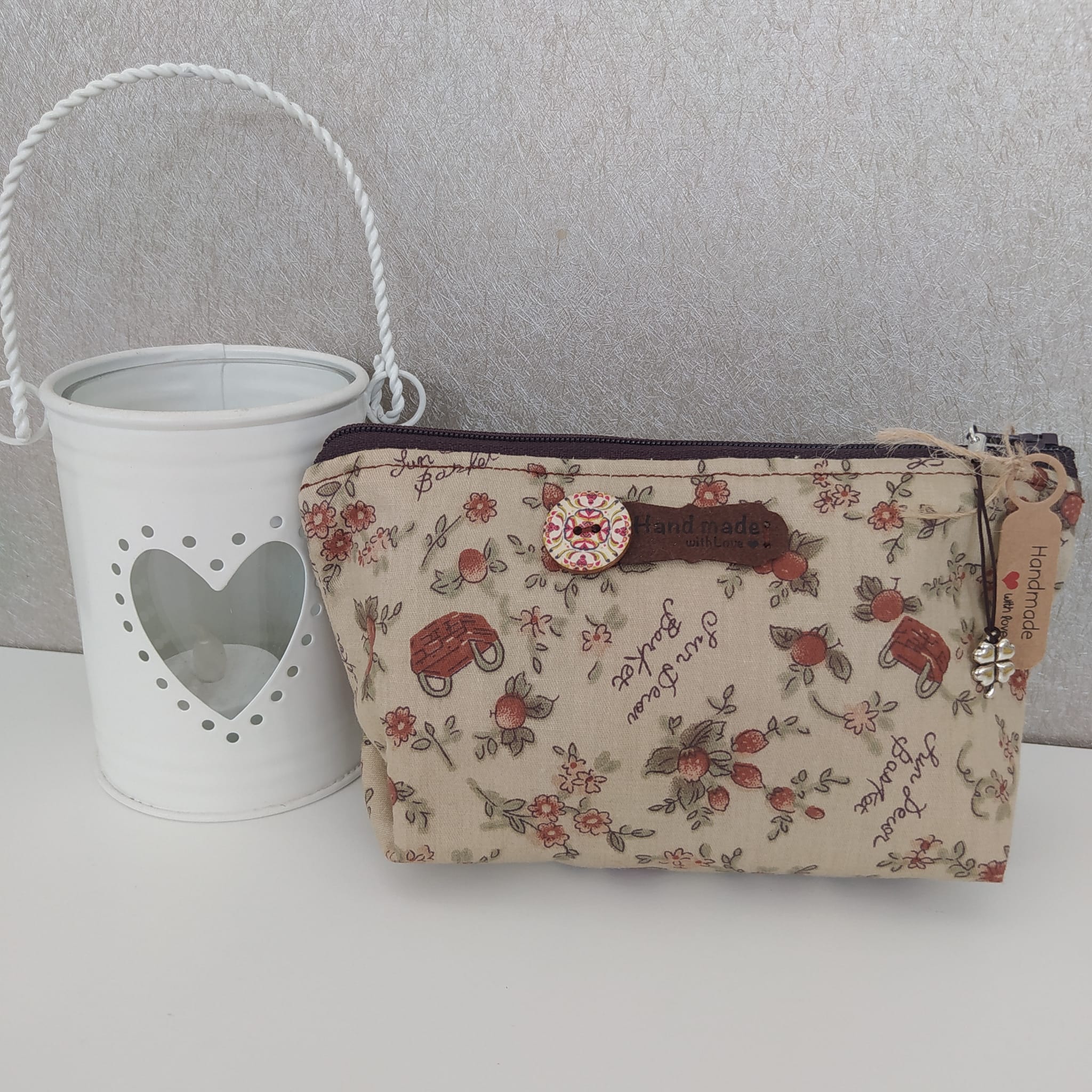 Pchette da borsa in cotone foderato con etichetta in camoscino, bottoncino in legno e pendaglio.