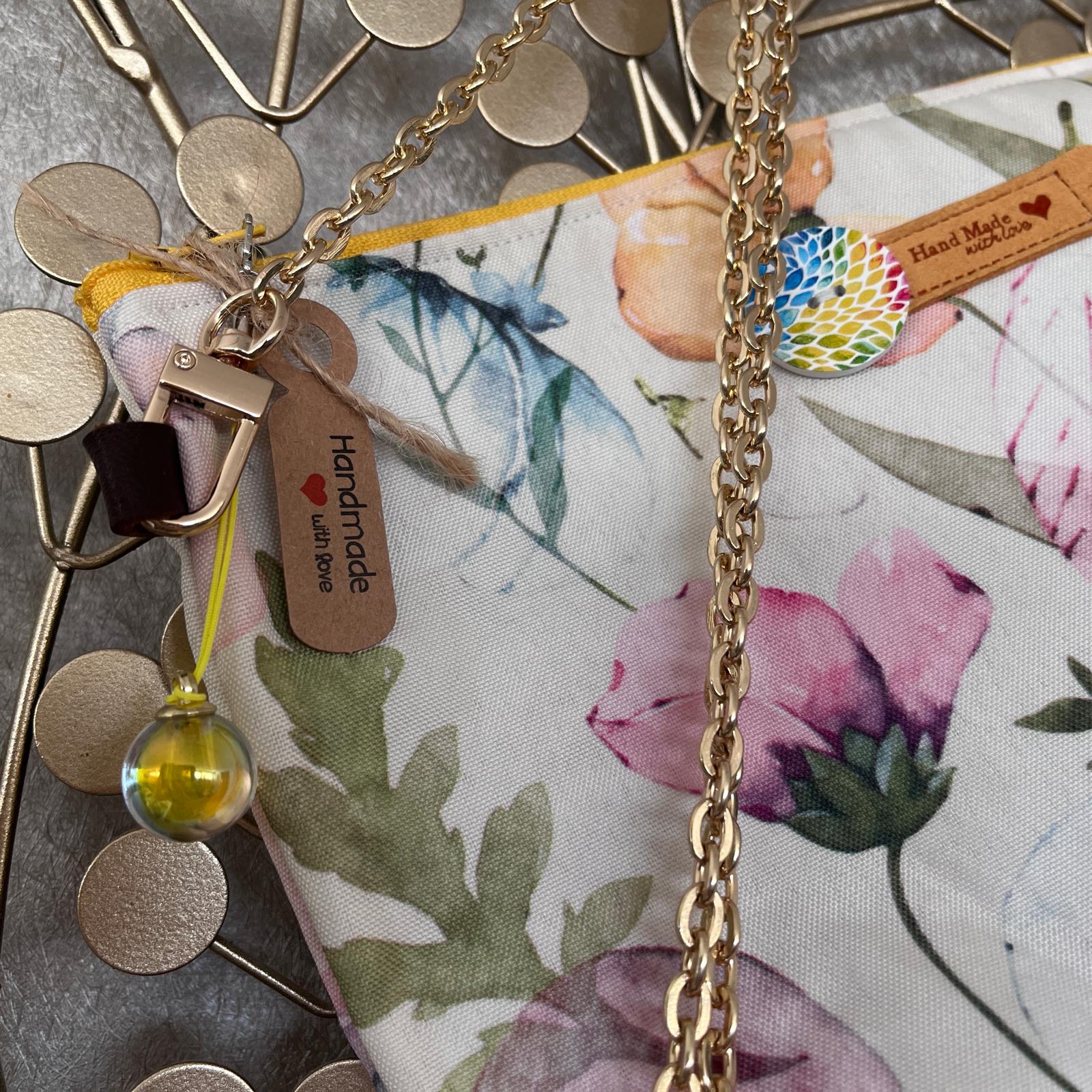 Borsetta con motivo floreale, bottoncino in legno, etichetta in camoscino, pendaglio, tracolla in metallo dorato. Interno in lino e cotone.
