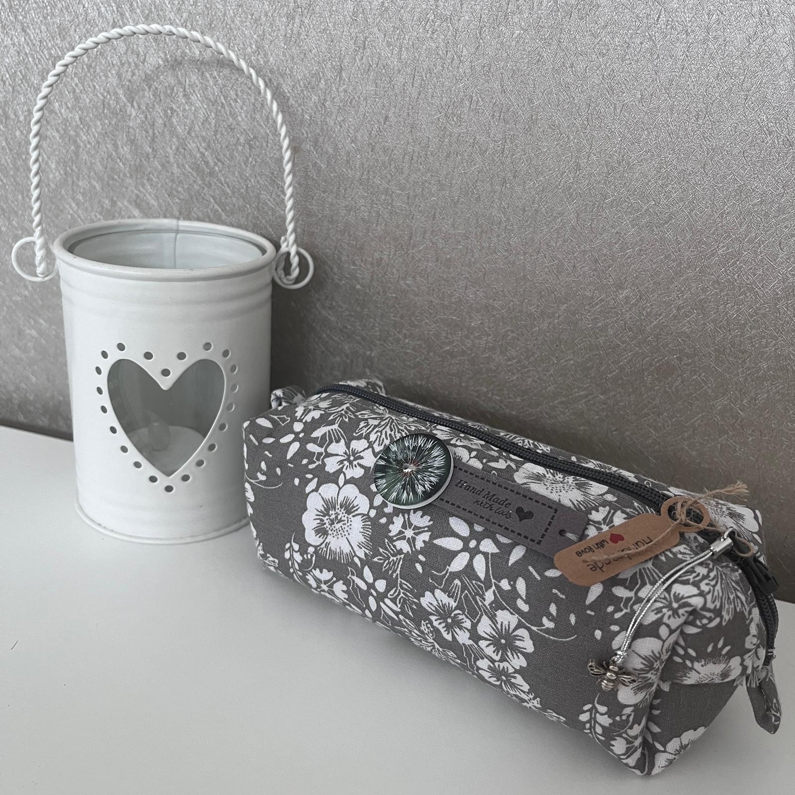 Astuccio in cotone con fodera, etichetta, bottoncino in legno e pendaglio.